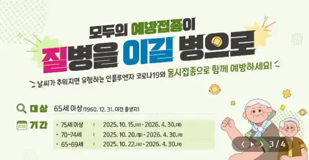 만 65세 이상의 어르신은 독감 예방접종을 무료로 받을 수 있습니다. 독감은 고령층에서 더욱 치명적인 영향을 미칠 수 있기 때문에, 매년 접종을 권장하고 있습니다.